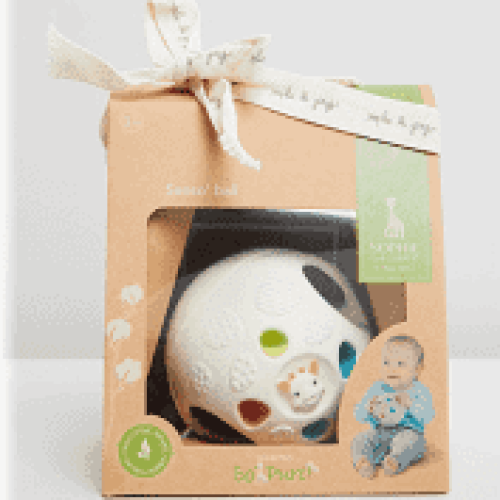 The Sophie the Giraffe Senso Ball is a sensorial ball made from 100% natural rubber with bright colours, small holes and a multitude of textures (rounded dots, streaks, stars, grid...). It is lightweight, ergonomic, and is easy to grasp thanks to its two integrated handles. A fun toy for baby to squish, hold, throw, and touch!